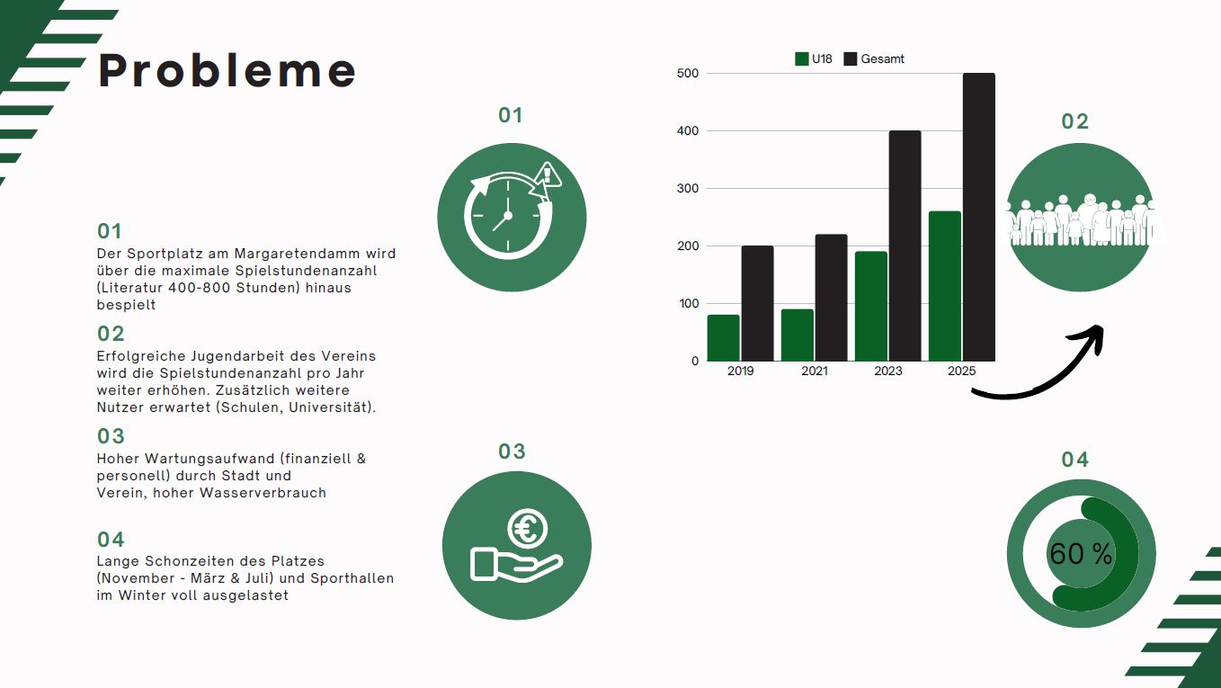 Der hohe Wartungsaufwand des Naturrasenplatzes stellt finanziell und personell eine enorme Belastung dar. Auch erfordert die Instandhaltung des Platzes einen hohen Wasserverbrauch, was aus ökologischer Sicht zunehmend problematisch ist.