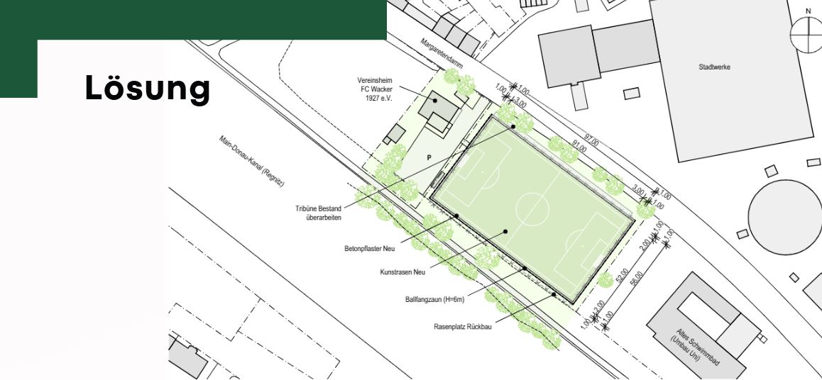 Seit 2021 arbeitet die neu gewählte Vorstandschaft des FC Wacker Bamberg intensiv am Projekt des Kunstrasenplatzes. Unter ständiger Berücksichtigung des magischen Dreiecks aus „Wirtschaftlichkeit“, „Nachhaltigkeit“ und „Spieleigenschaft“ wurden zahlreiche Referenzprojekte untersucht, Gespräche mit anderen Vereinen in ähnlicher Situation geführt (deutschlandweit) und im Februar 2024 eine umfassende Kostenschätzung eingeholt. Auf dieser soliden Basis entstanden Ende 2023/Anfang 2024 die ersten Projektentwürfe.