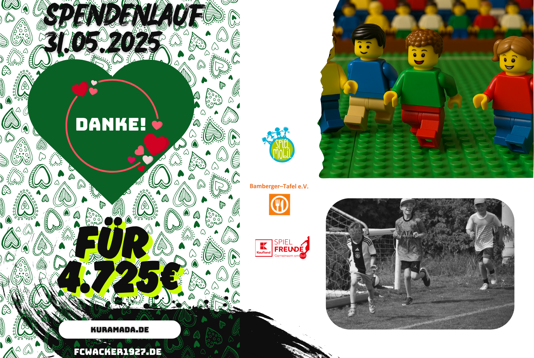 Ein besonderes Highlight gab es nochmal am letzten Maitag. Der FC Wacker Bamberg veranstaltete einen Spenden- und Legendentag am Margaretendamm. Mit dem Spielmobil Bamberg, gemeinsames Nudelessen mit der Tafel Bamberg und dem Legendenspiel war Einiges geboten für Groß und Klein. Höhepunkt war der einstündige Spendenlauf um den Sportplatz. Mit Hilfe vieler rennenden Kinder und großzügiger Spendengeber konnten wir die beeindruckende Spendensumme von 4.725€ sammeln; zusätzlich gingen knapp 300€ an die Tafel Bamberg. Wieder eine starke Teamleistung unserer ganzen Community!