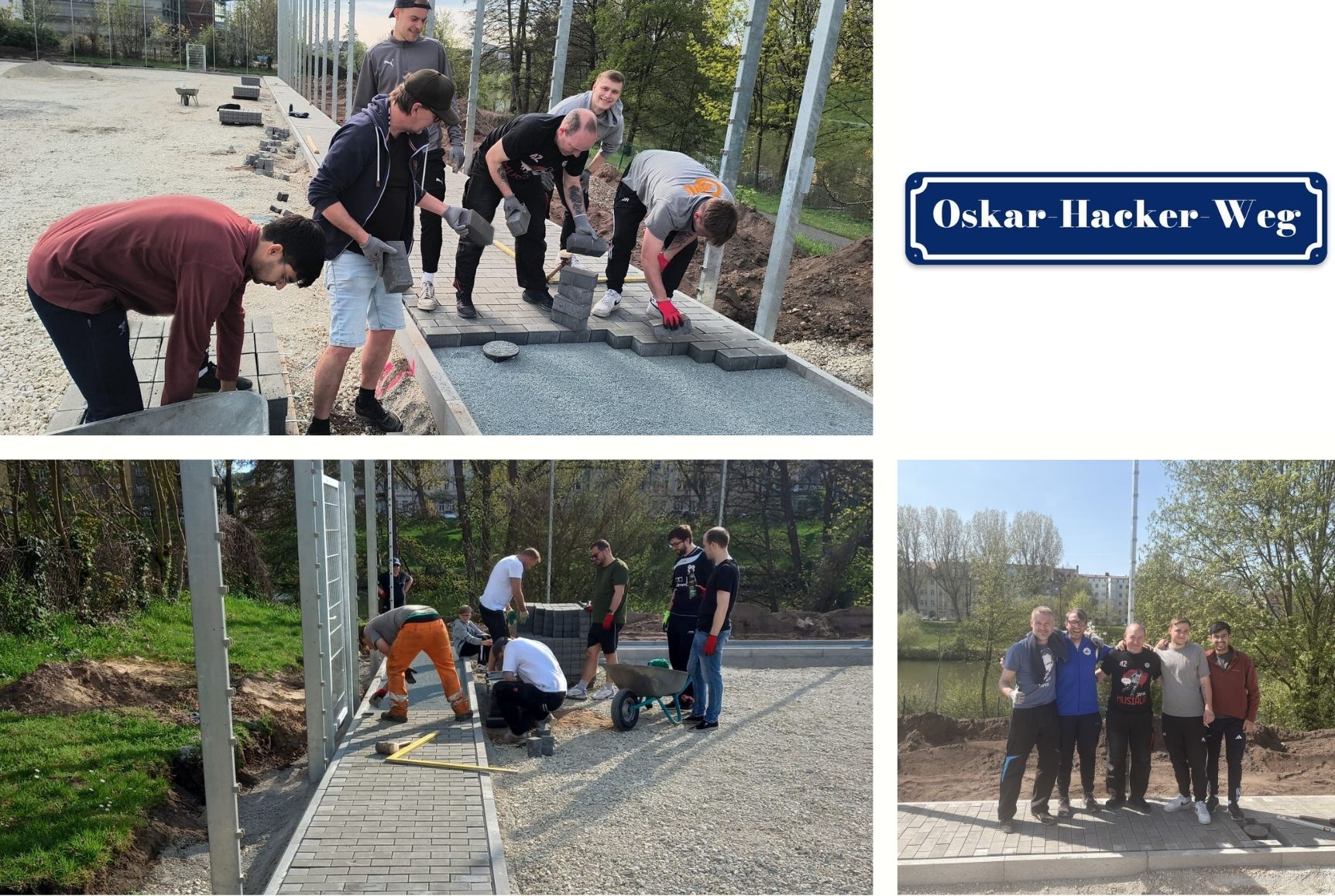 Aus Vereinssicht war das absolute Highlight jedoch der vergangene Freitag und Samstag (17. und 18. April). Über zehn Helferinnen und Helfer des FC Wacker pflasterten in beeindruckender Teamarbeit rund 130 m² Weg rund um den neuen Kunstrasenplatz. Damit ist bereits die Hälfte des zukünftigen Oskar‑Hacker‑Wegs geschafft. Eine wahre Meisterleistung, angeführt von Jörg Rührer, der sich selbst von einem nächtlichen Sturz nicht bremsen ließ und wie eine Maschine dafür sorgte, dass dieses Mammutprojekt in kürzester Zeit umgesetzt wurde. Wir bedanken uns bei allen helfenden Händen: Jörg, Roland, Alex, Simon, Stefan, Marius, Markus, Theo, Jürgen U, Jürgen P, Gregor, Stoffel, Finn, Pablo, Kim, Leo.